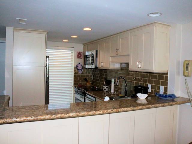 We invite you to enjoy our renovated condo. Located on the top floor and an end unit, it has one of the most spectacular views of the beach, boardwalk, ocean, and the Northern End of Virginia Beach. The recent renovation includes a remodeled kitchen and two baths, all featuring Cambria quartz countertops, and new ceramic tile flooring throughout. The kitchen also features new cabinetry, stainless steel appliances and has everything you need to prepare meals and snacks: new Cuisinart cookware, microwave, small appliances, coffee pot and all the utensils you need. The dining room seats 6 for family meals. The new open floorplan leads to a spacious living room that provides spectacular views and a balcony with chairs and a table. The living room also features a 42in LED TV with DVD player. The master bedroom features a king size bed and flat screen TV, and the second bedroom contains a queen size bed, a bunkbed, and a flat screen TV. Cable TV in all three rooms includes HBO. The living room sofa opens to a queen bed – a perfect unit for family vacations at beautiful Virginia Beach! Enjoy the views and peacefulness of 12th floor Edgewater at our welcoming condo!