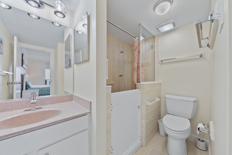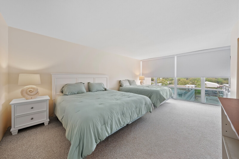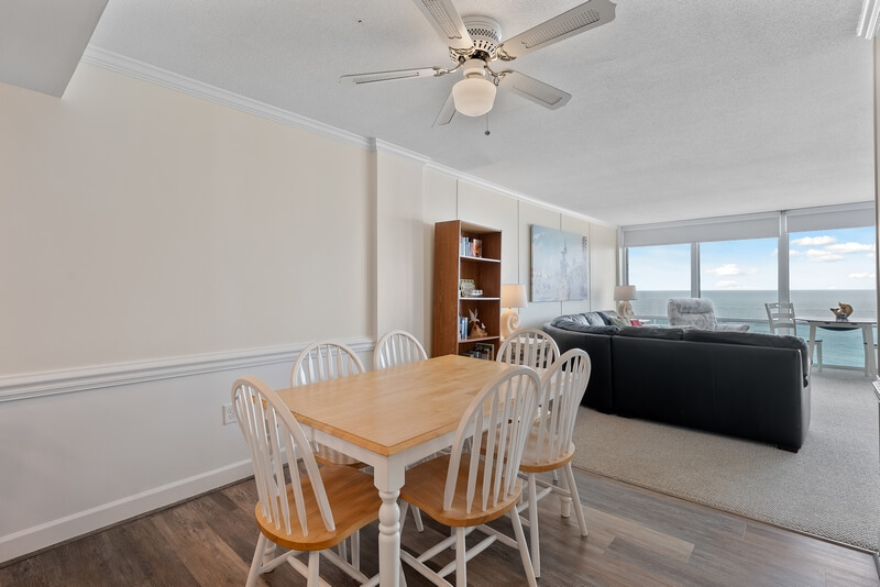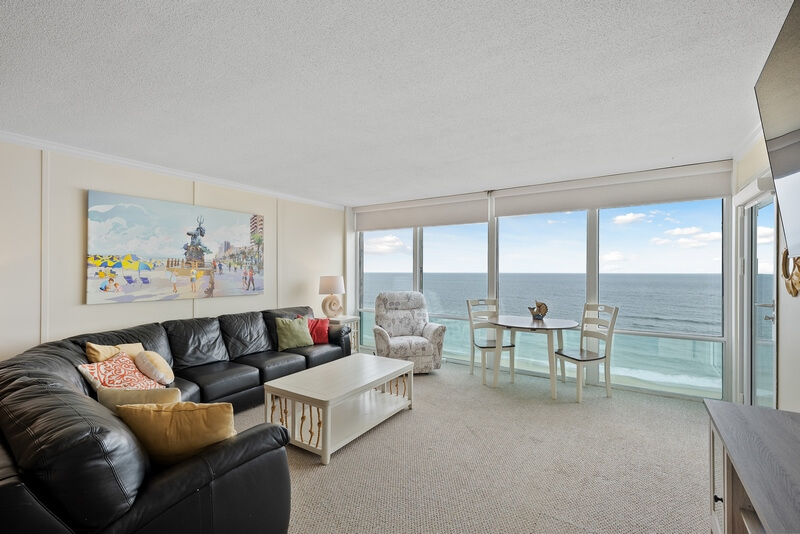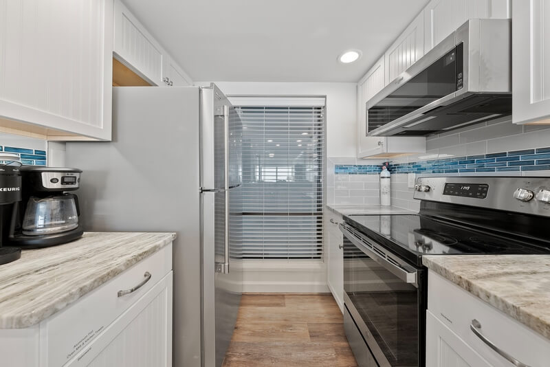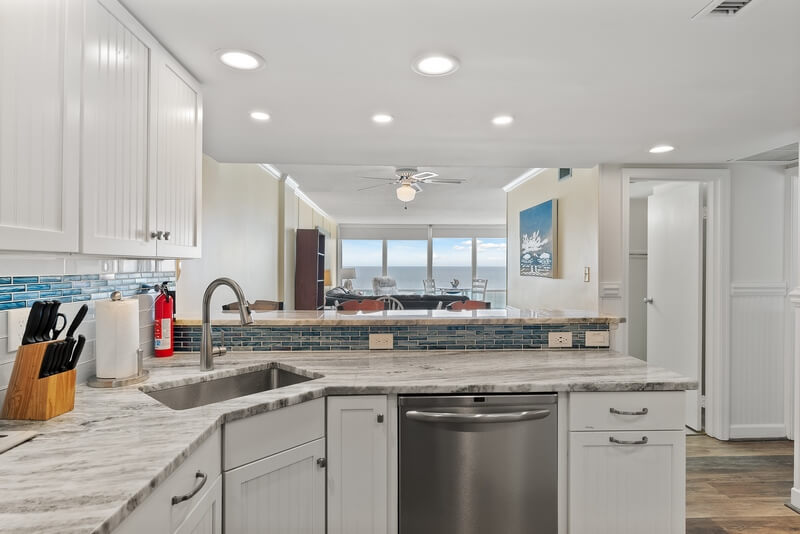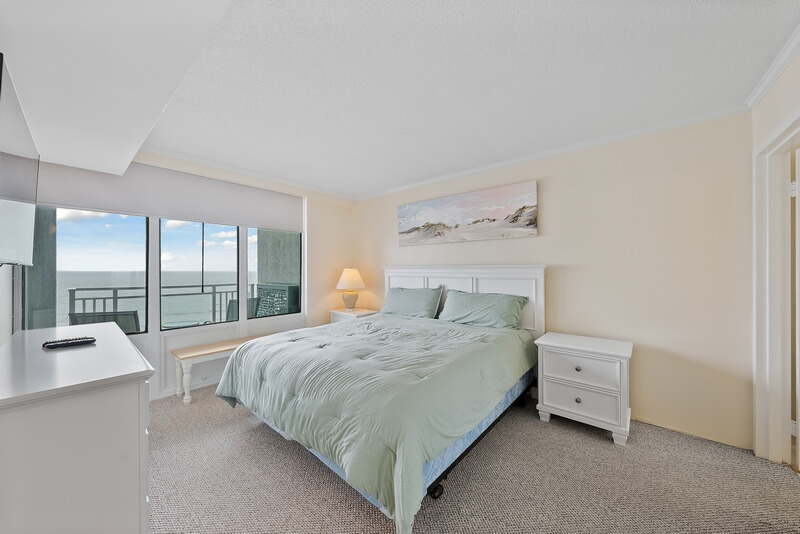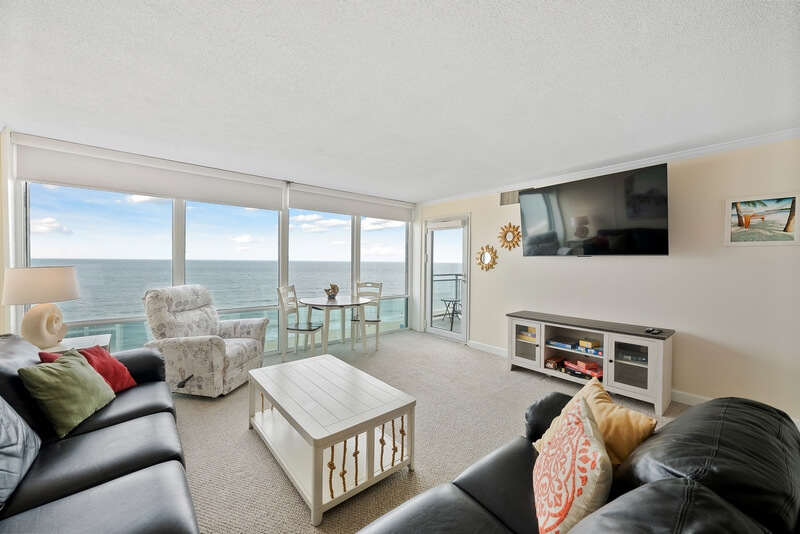 Our beautiful condo has a new kitchen (2020) and new coastal style furniture and decor throughout making this condo a perfect place to enjoy your vacation. This end unit condo is furnished with one king sized bed in the master suite with a TV while the large second bedroom has a king sized bed and a queen sized bed as well as a smart TV. The living room is comfortable and inviting for watching the 50” smart TV and enjoying the floor to ceiling, wall to wall ocean view. Our Kitchen is fully stocked, has bar seating and the dining area has a table to seat six. The balcony has a pair of chairs and a small bistro table, perfect spot to enjoy the oceanfront breeze.